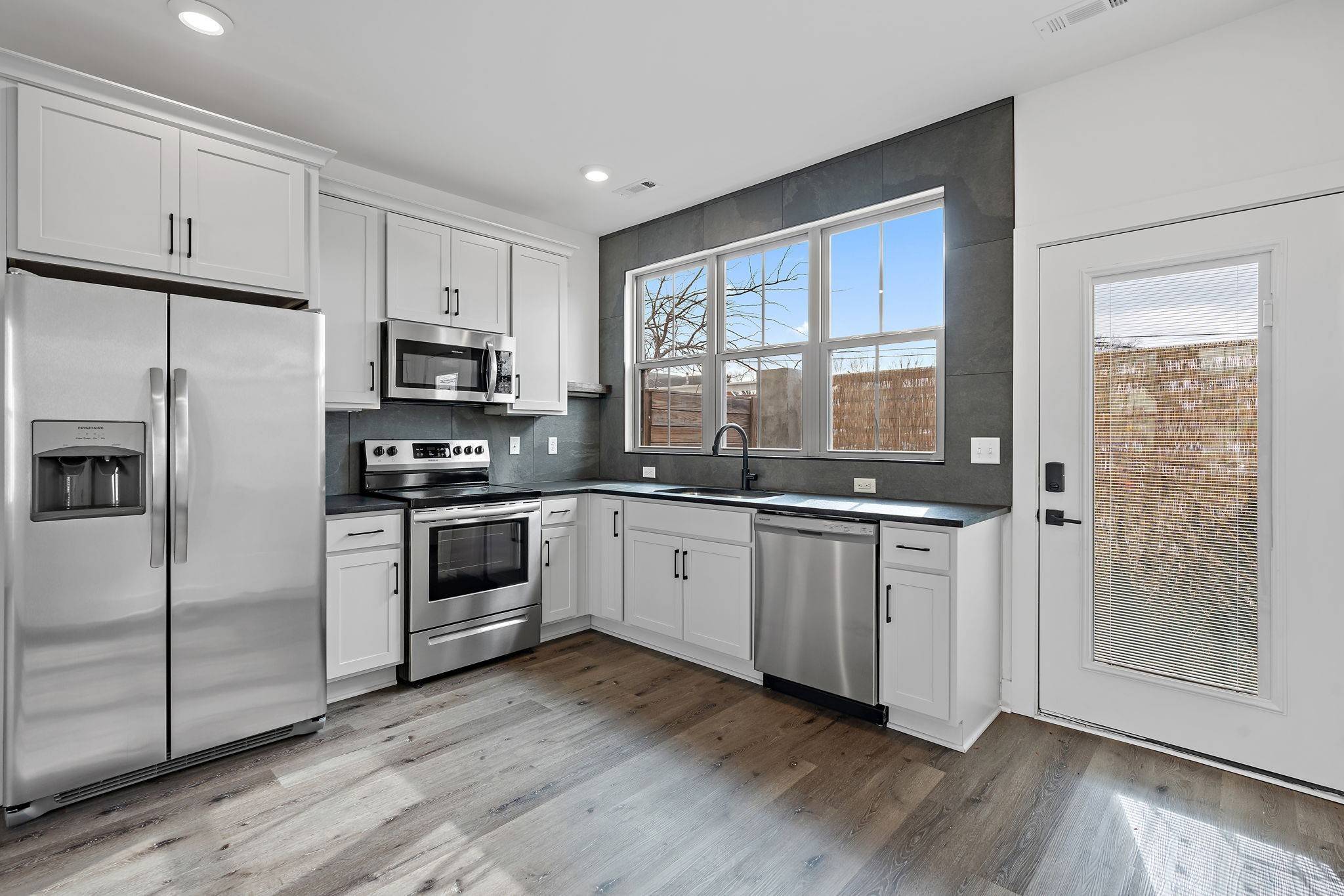 Step inside to find a bright and airy open-concept living space with modern finishes, hardwood floors, and natural light pouring into every room. The kitchen is sleek and functional, and there's a private green space out back—perfect for your morning coffee or letting your pup play.